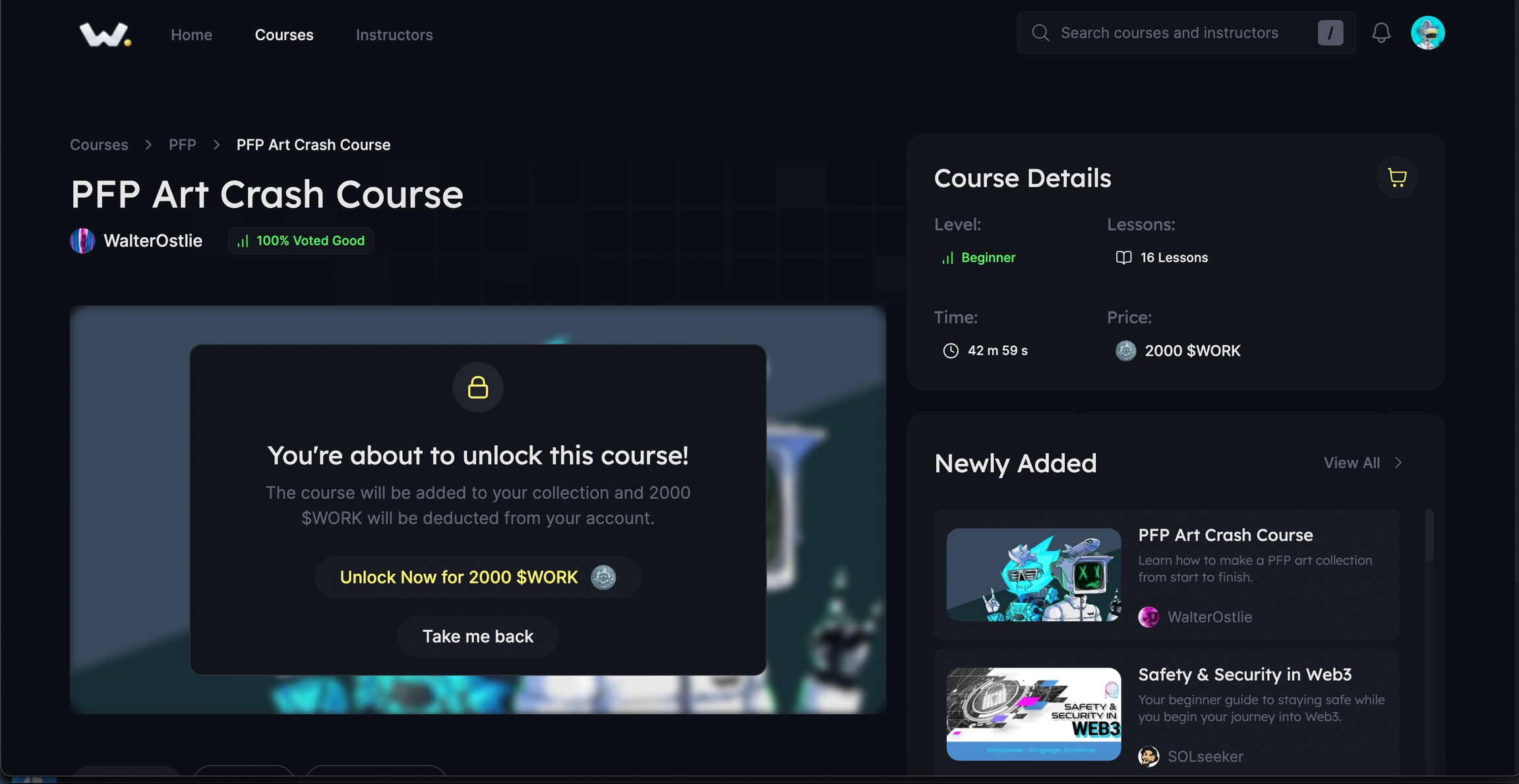🔍 Found a course that piques your interest? Click on it! Over on the right, you'll see Course Details like the number of lessons, the cost in $WORK tokens, and its difficulty level.